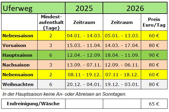 • Bei Aufenthalt von mehr als 6 Tagen ist die Endreinigung/Wäscheausstattung im Preis enthalten.